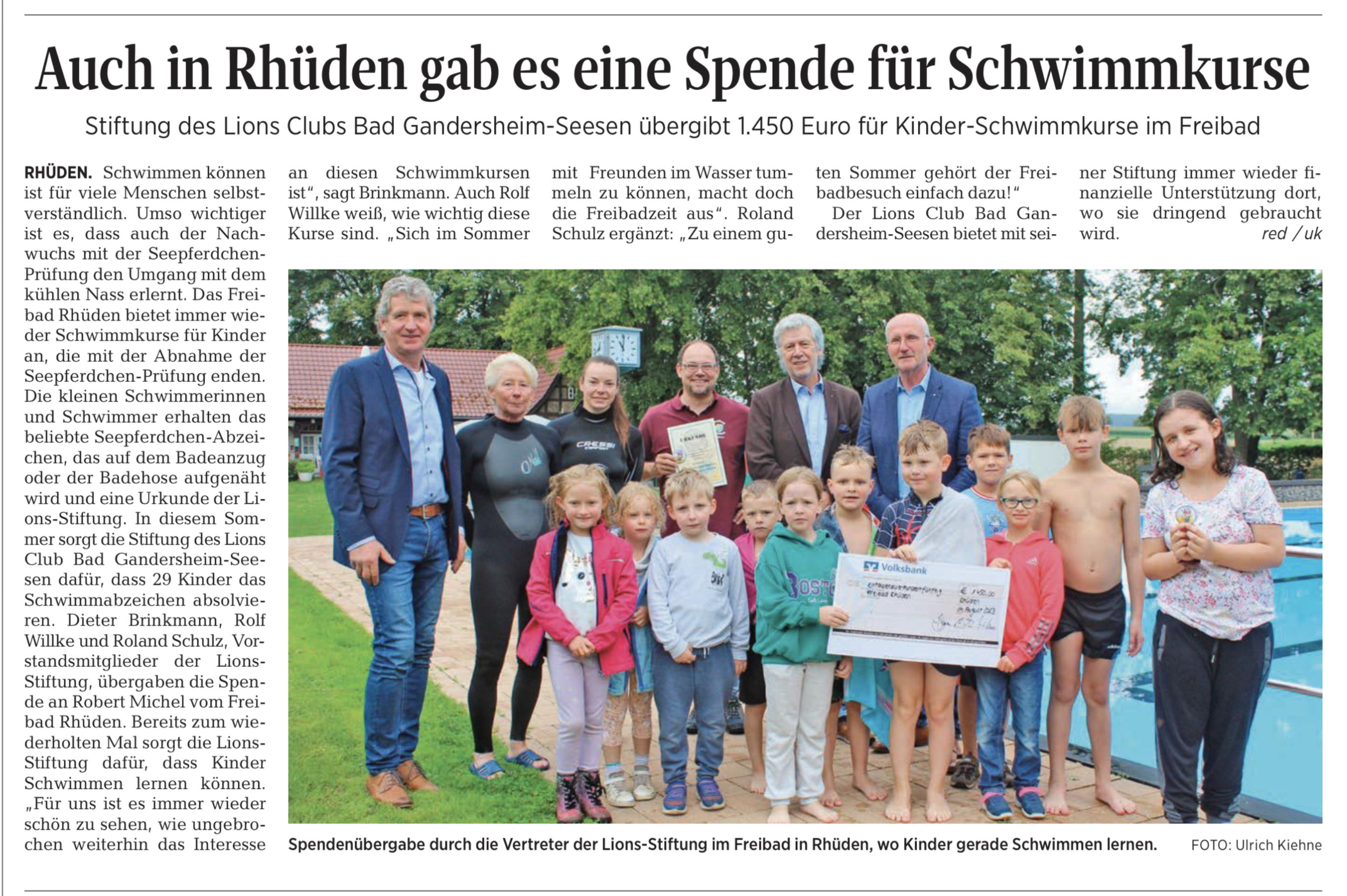 RHÜDEN. Die Stiftung des Lions-Clubs Bad Ganders-heim-Seesen sorgt mit einer erneuten Spende über 2.000 Euro dafür, dass Kinder im Freibad Rhüden weiterhin Schwimmkurse erhalten.